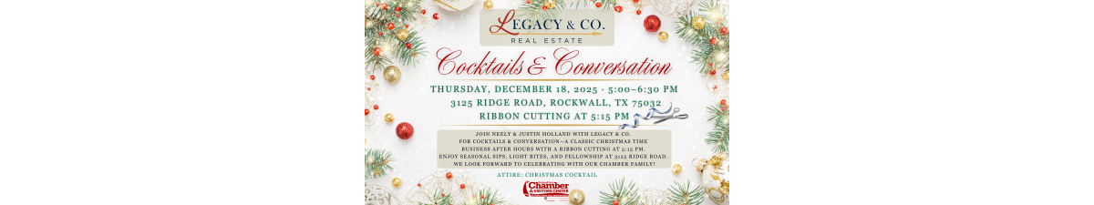 Join Neely & Justin Holland with Legacy & Co. for Cocktails & Conversation—a classic Christmastime Business After Hours with a Ribbon Cutting at 5:15 PM. Enjoy seasonal sips, light bites, and fellowship at 3125 Ridge Road. Attire is Christmas cocktail. We look forward to celebrating with our Chamber family!