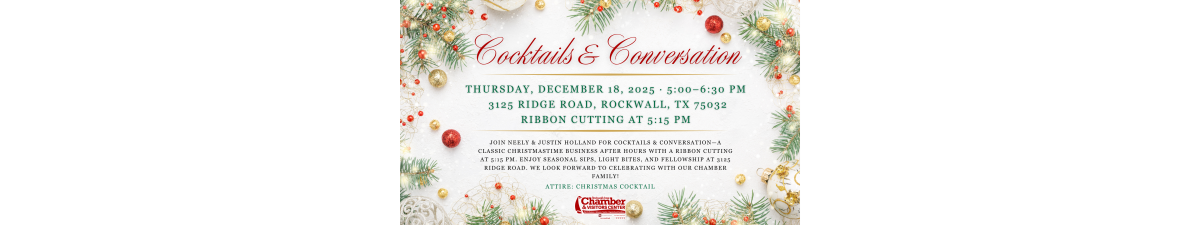 Join Neely & Justin Holland for Cocktails & Conversation—a classic Christmastime Business After Hours with a Ribbon Cutting at 5:15 PM. Enjoy seasonal sips, light bites, and fellowship at 3125 Ridge Road. Attire is Christmas cocktail. We look forward to celebrating with our Chamber family!